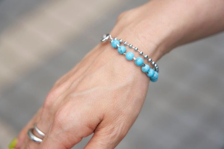 シルバーのボールチェーンとターコイズを組み合わせたブレスレットは、初夏にぴったり。「トップスの色に合わせて、ターコイズのブレスレットをつけました」(金さん)