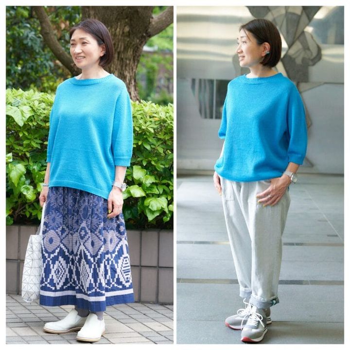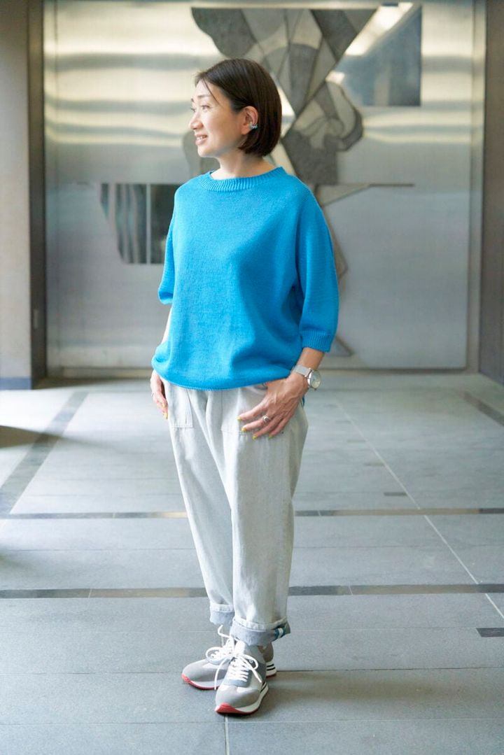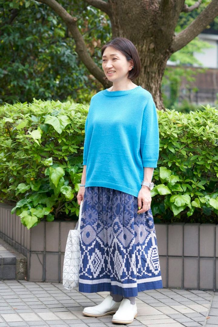 おしゃれな人のリアルな着こなしを拝見する「1週間コーデ」。今週はアパレルブランド「ケイ ハヤマ プリュス」MDの金 由美子(こん ゆみこ)さん(55歳/身長152cm)。金曜日はターコイズブルーのサマーニットを主役に、スカートとパンツを着まわしました。おしゃれプロのスタイリングテクをご紹介!