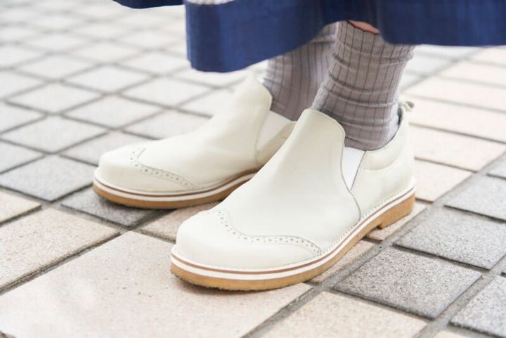 「展示会ではとにかく歩きまわるので、足に負担がかからなくて歩きやすいスリッポンを選びました」と金さん。ウイングチップ模様とオフホワイトレザーがカジュアルになりすぎず、オフィシャルなシーンでも活躍します。「このスリッポンもロングセラーです」