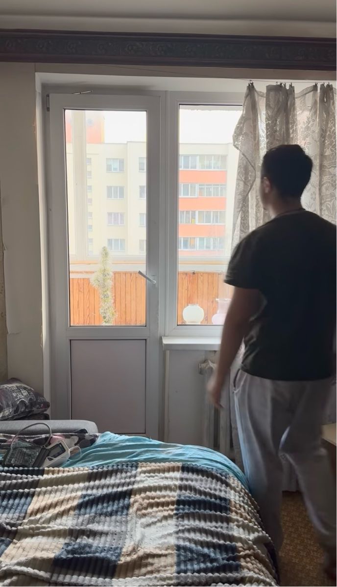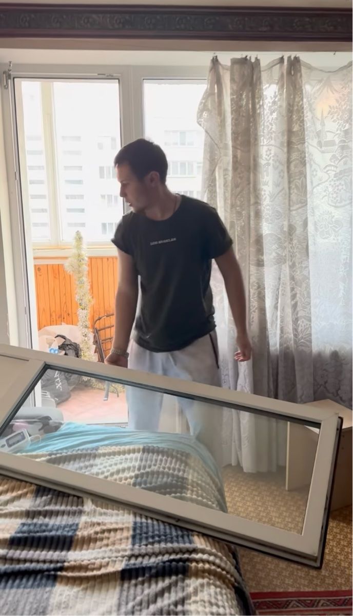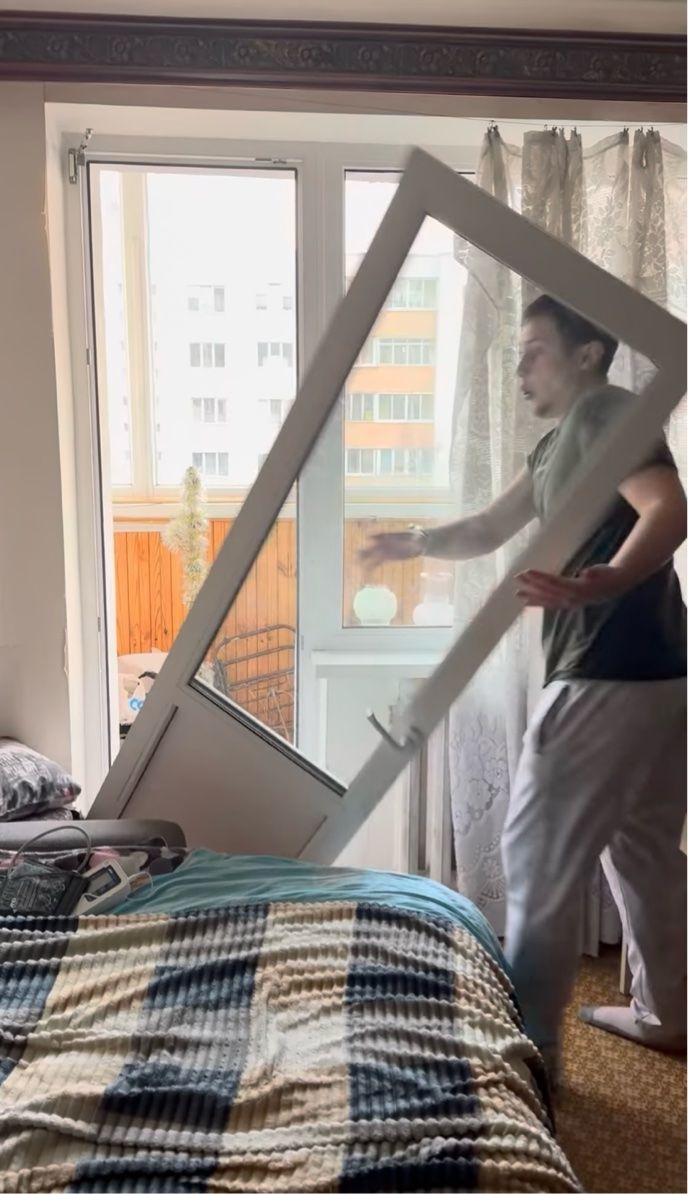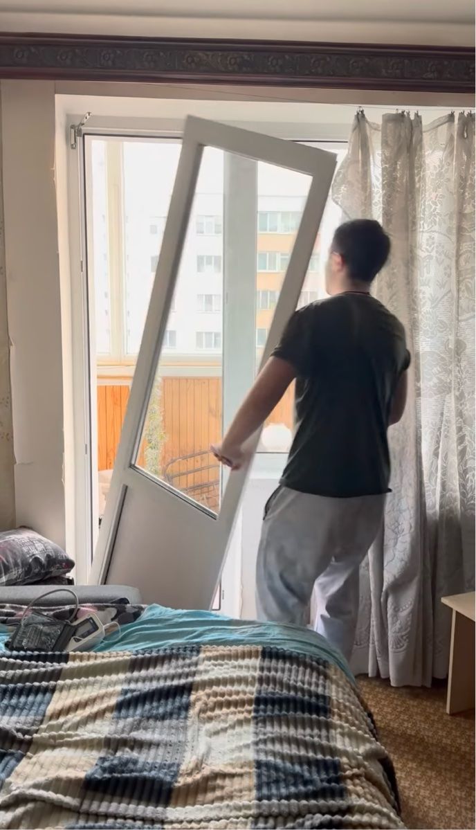 ベッドがクッション代わりになってくれた点も助かりました。 もしも床に倒れていたら、ガラスが大破した可能性もありますね! ドアをなんとか受け止めた男性の顔には、困惑がにじみ出ていました。