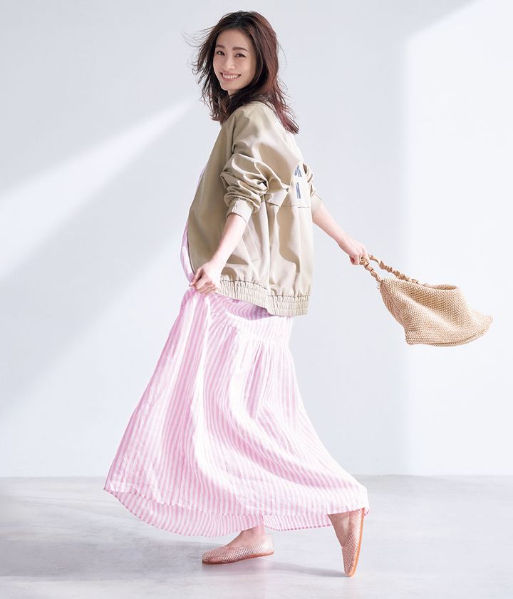 ピッチの細いストライプ柄だから、ピンクが抑えられて一層柔らかさを演出できる多幸感でいっぱいのワンピース。バックのロゴが効いたメンズライクなジャケットでドレスダウンすれば、リラクシーなワンピもタウンユース仕様に。ジャケット¥52,800(ルルヴェ/ジャック・オブ・オール・トレーズ プレスルーム)ワンピース¥51,700(ロベルト フリッドマン/トレメッツォ)バッグ¥58,300(アニタビラルディ/ハウス オブ ロータス)サンダル¥20,900(エンシェントグリークサンダルズ/RHC ロンハーマン)