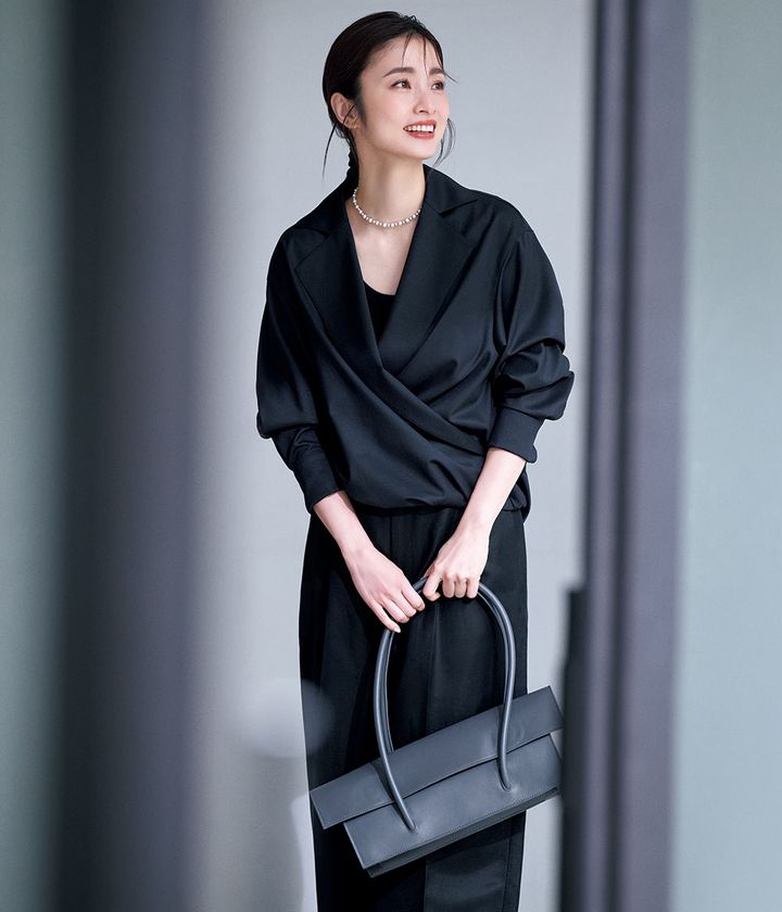 落ち感のあるとろみ素材やカシュクールタイプのシャツなど、デザイン性のあるアイテムを選べば、オールブラックでも場に馴染みつつ存在感を放てます。セットアップ風に着こなせば、上品で洗練された雰囲気に。シャツ¥53,900(エステータ/オンワード樫山 お客様相談室)タンクトップ¥34,100(マディソンブルー)パンツ¥53,900(エイトン/エイトン青山)バッグ¥44,000(モフィオラ/アマン)ネックレス¥209,000(ミズキ/リトルリーグ インク)