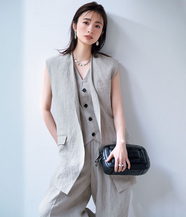 スリーピースに見えて実はセットアップという、シンプルだけど一癖あるデザイン。柔らかなリネン素材だからかっちりした印象にならず、リラクシーな雰囲気にも振れる。ストレスフリーな着心地も嬉しい。ジレ¥86,900パンツ¥53,900(ともにアンスクリア/アマン)バッグ¥172,700(ピエール アルディ/ピエール アルディ 東京)ピアス¥46,200ネックレス¥149,600リング¥59,400(すべてノアーク/ノウン)