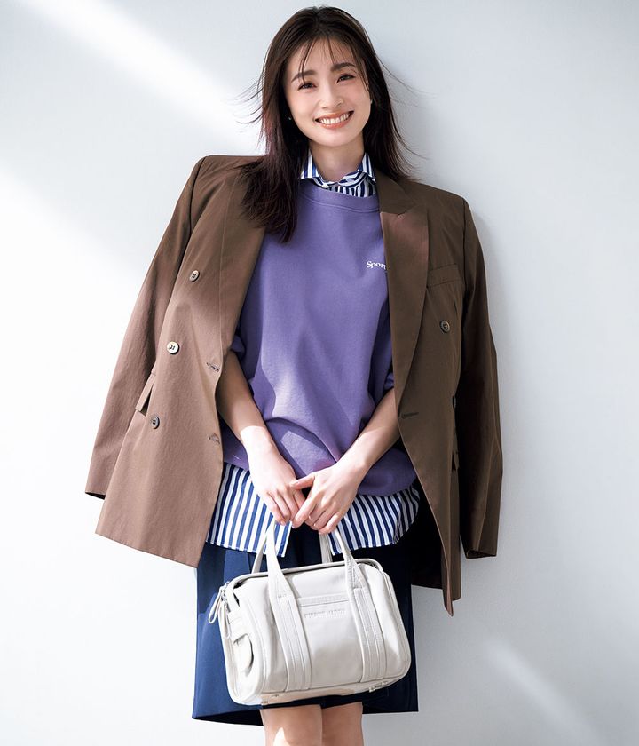 ジャケット¥165,000(アッシュ/コロネット)スウェット¥33,000※参考価格(スポーティー&リッチ/ザ・ウォール ショールーム)シャツ¥53,900(セブリン/アルアバイル)パンツ¥49,500(アンスクリア/アマン)バッグ¥199,100(ピエール アルディ/ピエール アルディ 東京)ピアス¥39,600(MAAYA)