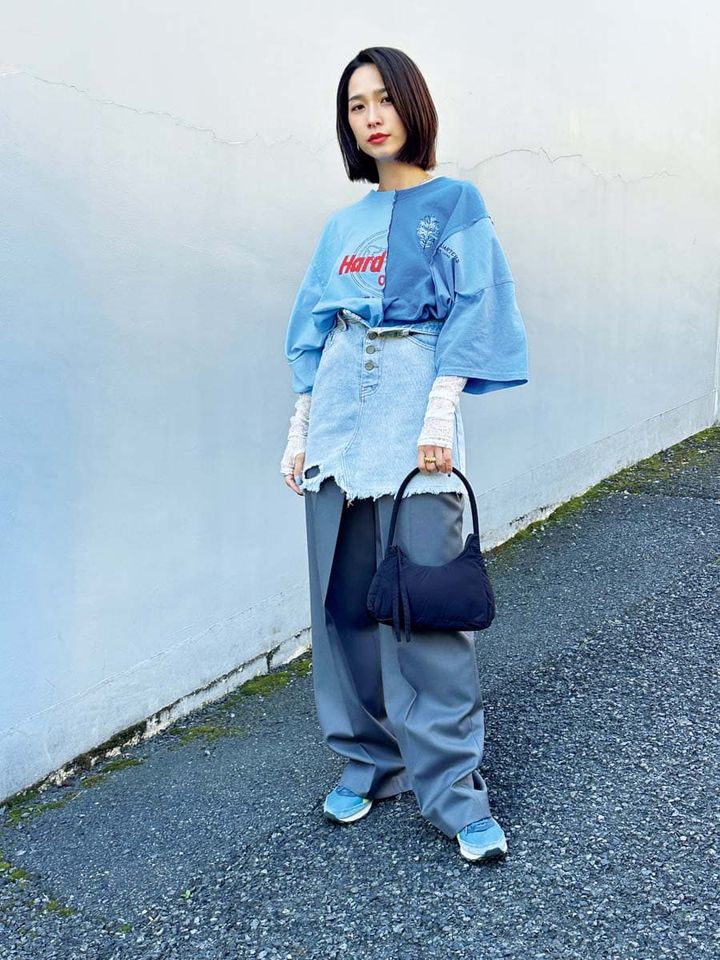 Tシャツ¥34,100/BUZIGAHILL、パンツ¥46,200/LOW CLASSIC、バッグ¥18,480/kokyo(以上すべてグレープヴァイン バイ ケイスリー)、レーストップス¥13,200、スカート¥8,800/ともにG.V.G.V.、ピアス¥16,500、リング¥24,750/ともにNUUK(以上すべてk3 OFFICE)、その他/本人私物