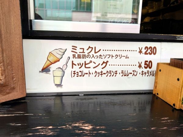 「ミュクレ」というソフトクリームも人気です。お値段も230円とお得☆本当はこちらもいただきたかったのですが、一人で来ていたので、クレープを食べてるうちに溶けてしまうことを考えて今回は諦めました…