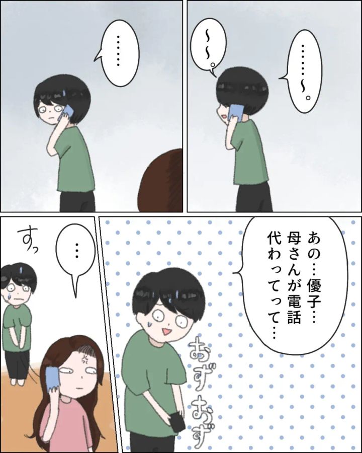 スマホで話している良太。少しして、「あの・・優子・・母さんが電話代わってって・・」そう言っておずおずとスマホを差し出されて受け取ると、