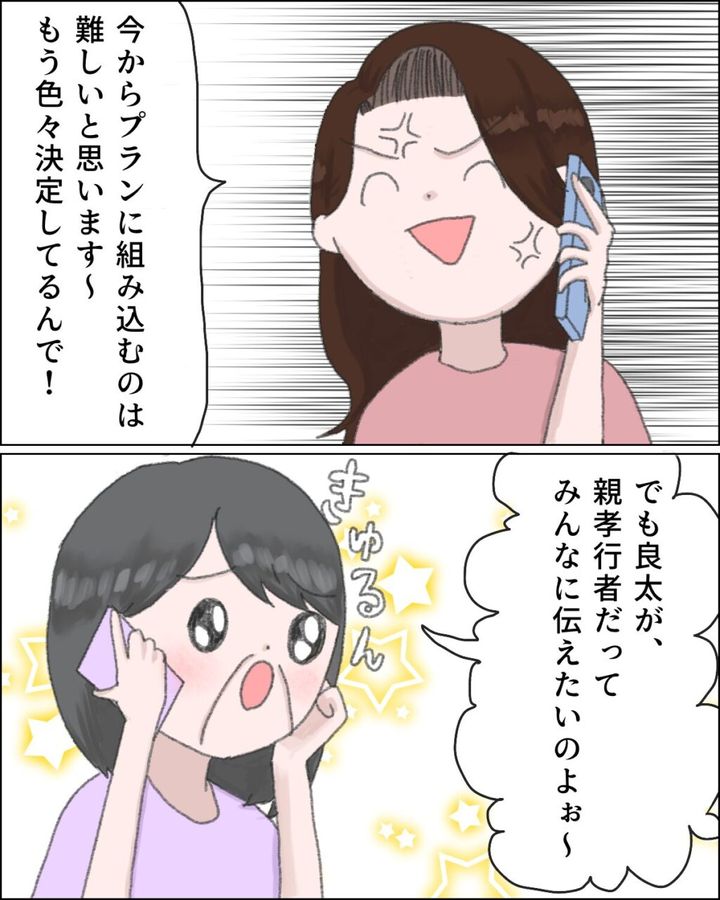 「今からプランに組み込むのは難しいと思います~。もう色々決定してるんで!」怒りをこらえながらそう言うと、「でも良太が、親孝行者だってみんなに伝えたいのよぉ~」きゅるんとした目をして言う義母。