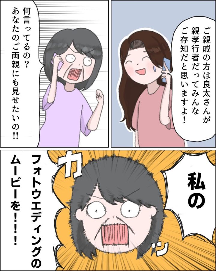 「ご親戚の方は、良太さんが親孝行者だってみんなご存知だと思いますよ!」私の言葉に、「何言ってるの?あなたのご両親にも見せたいの!!私のフォトウエディングのムービーを!!」と義母は力を込めて言い放ちました。