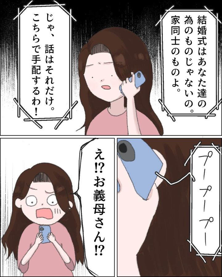 「結婚式はあなた達の為のものじゃないの。家同士のものよ。じゃ、話はそれだけ。こちらで手配するわ!」義母は自分の伝えたいことを言うと私の返事を待たず電話を切ってしまいました。「え!?お義母さん!?」理解の追いつかない私は、切れた電話に向かって義母に呼びかけていました。