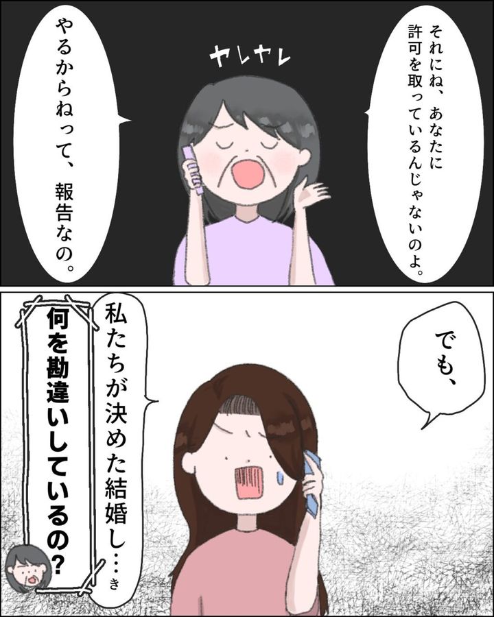 「それにね、あなたに許可を取っているんじゃないのよ。やるからねって、報告なの」やれやれといった感じで呆れたように義母に言われ「でも、私たちが決めた結婚し・・き」と反論しようとすると、「何を勘違いしているの?」とピシャリと言われました。