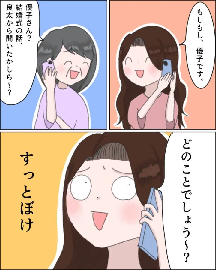 「もしもし、優子です」と言うと、「優子さん?結婚式の話、良太から聞いたかしら~?」義母の言葉に、「どのことでしょう~?」と得意のすっとぼけを決め込むと、