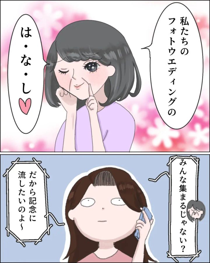 「私たちのフォトウエディングのは・な・し!みんな集まるじゃない?だから記念に流したいのよ~」義母の言うことを黙って聞いていた私は、