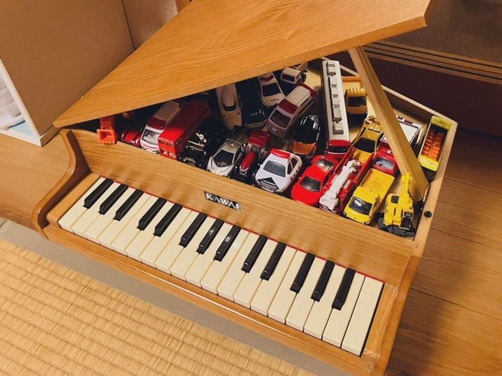 小さな木製ピアノの中にびっしりと入っているのは、カラフルなミニカー。赤ちゃんのころは楽器として楽しんだであろうピアノですが、5年がたった今では立派な駐車場として活用されているよう。本来の使い方ではないものの、ピアノを生活の一部として、さまざまな形で楽しんでいるとも考えられそうです。