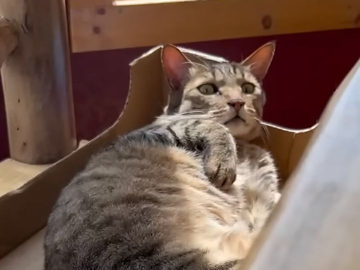 「浅いし落ち着かない!」不満そうな猫さんの箱チェック