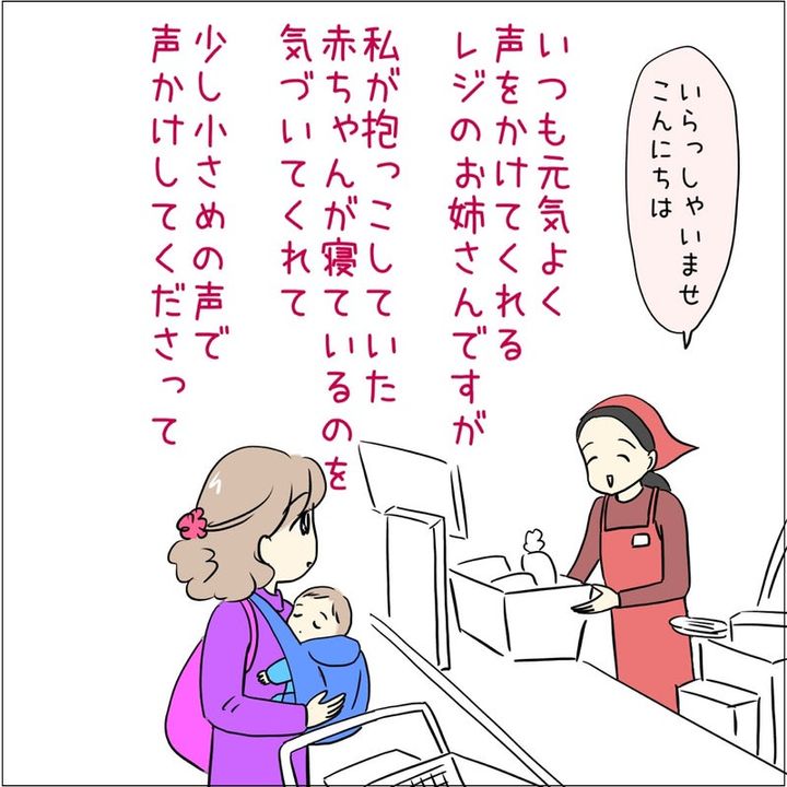 女性が抱っこしていた赤ちゃんが寝ていることに気づいたレジのお姉さんは、小声で話しかけてくれました。さらに、袋詰めまで手伝ってくれて、女性はとても嬉しかったそうです。後日、同じレジに並んで名前を確認し、嬉しかったことを「お客様の声」として投函したそうです。