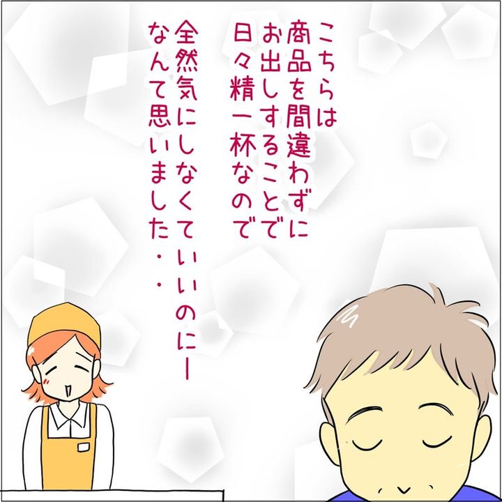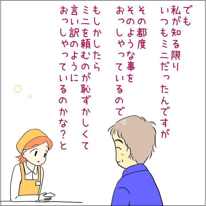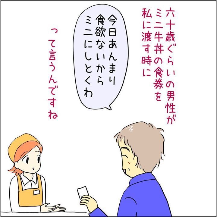 お客さんは、ミニ牛丼の食券を渡す時に「今日あんまり食欲ないからミニにしとくわ」と言うのだそう。ですが、このお客さんはいつもミニを頼んでおり、そのたびに同じことを言うそうです。もしかすると、ミニを頼むのが少し恥ずかしいのかもしれない…と感じた女性店員。それでも「気にしなくていいのに」と思うのでした。