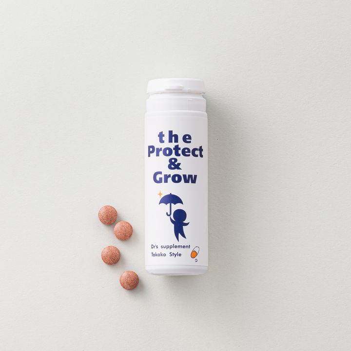 松倉クリニック代官山の貴子院長監修の医療用サプリメントブランド「TAKAKOスタイル」の飲む日焼け止め。光老化の原因となる紫外線UV-Aに対する防御効果が期待できる成分や抗酸化力を高める成分配合。日光を浴びる30分前に2錠の飲用がおすすめ。The Protect&Grow 60粒 5,940円/TAKAKOスタイル