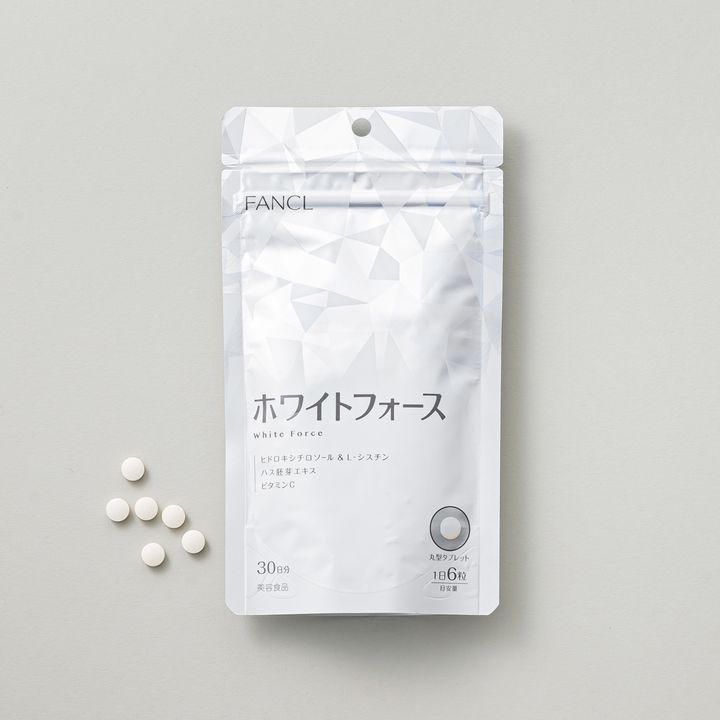 ファンケルこだわりの「ヒドロキシチロソール」と「L-シスチン」のWの組み合わせで内側からの唯一無二のアプローチ。手軽に飲みやすい小粒タイプなのも続けやすさへのこだわり。ホワイトフォース 30日分(180粒入り) 2,376円/ファンケル