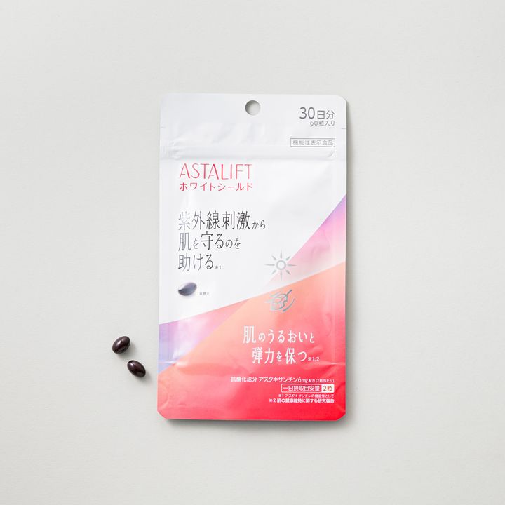 アスタリフトお馴染みの成分であり高い抗酸化作用を持つ「アスタキサンチン」と、ハリ・うるおいをサポートする成分配合で、紫外線対策だけでなく乾燥やハリ不足などの肌悩みもケア。夏場だけでなく1年を通して幅広い肌悩みに寄り添ってくれる存在。アスタリフト サプリメント ホワイトシールド 30日分(60粒入り) 4,320円/富士フィルム