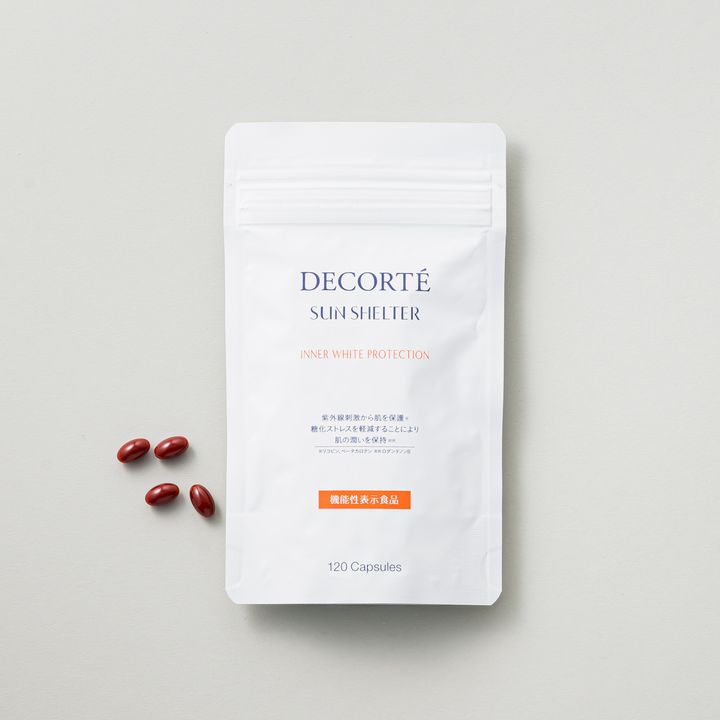 コスメデコルテの日焼け止めシリーズ「サンシェルター」から、紫外線刺激から肌を保護するサプリメントが満を持して登場。紫外線にさらされる前に素肌を守り、ビューティ効果も言わずもがな。インナーケアでもコスメデコルテを取り入れて。サンシェルター インナー ホワイトプロテクション 30日分(120粒入り)6,480円/コスメデコルテ