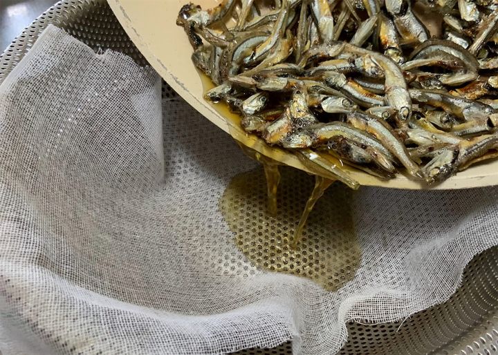 2.香りが出たら煮干しをザルにあげ、オイルをこす。