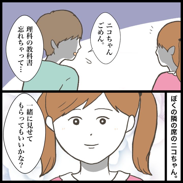 「隣の席のニコちゃんに教科書見せてもらえて、ラッキー!」