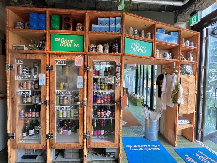店舗入り口には木で組み立てられた冷蔵庫にサイダーやビールが並んでいます。