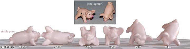 研究論文によれば、計算速度は従来比で単純な形状では約400倍、複雑な形状でも60倍にもなり、たとえばブタの形をした玩具サイコロ(有名なパーティーゲーム「Pass the Pigs」ではブタのミニチュアを振って出目を競います)の6通りの静止パターンと確率もわずか0.003秒(3ミリ秒)で計算できたと報告されています。