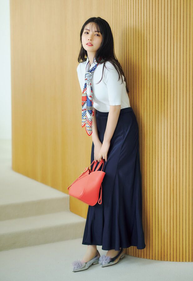 3. シルバーパンプス、スカーフ、カラーバッグ…旬の華やか小物で黒髪×モノトーンも即こなれ見え!