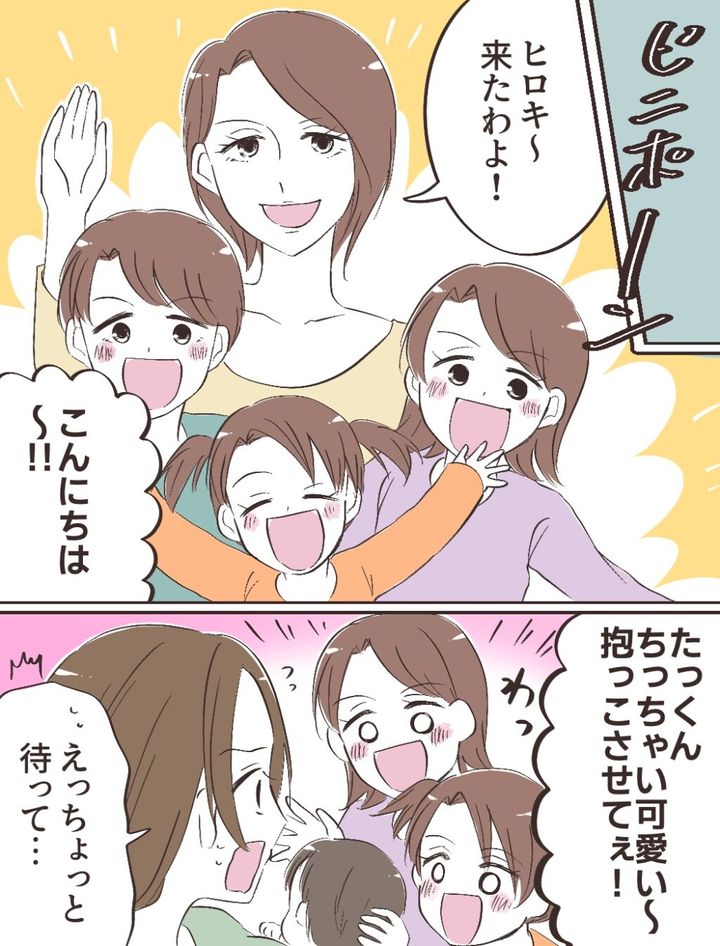 そして、ピンポーン。と玄関のインターホンが鳴り、「ヒロキ~来たわよ!」「こんにちは~!!」とチエさんと子どもたちがやって来ました。「たっくん、ちっちゃい可愛い~!抱っこさせてぇ!」と一気にたっくんの周りを囲む子どもたちに、「えっ、ちょっと待って・・・」と驚く私。
