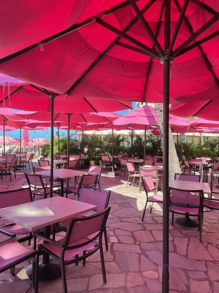 一面ピンクのテラス席。ビーチ沿いの席も大人気。