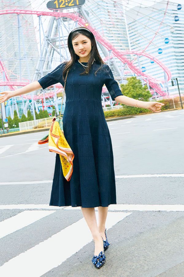 ニットワンピース¥23,100/CELFORD バッグ¥7,700/オリエンタルトラフィック(ダブルエー) バッグに巻いたスカーフ¥22,000/マニプリ カチューシャ¥1,320/アネモネ(サンポークリエイト) パールネックレス¥22,000/ジゼルベー(ズットホリック) ピアス¥16,280、コインネックレス¥11,000、リング¥8,360/以上チビ・ジュエルズ(チビジュエルズ・ジャパン) ブレスレット¥8,800/ココシュニック オンキッチュ(ココシュニック) パンプス¥16,500/ダイアナ(ダイアナ 銀座本店)