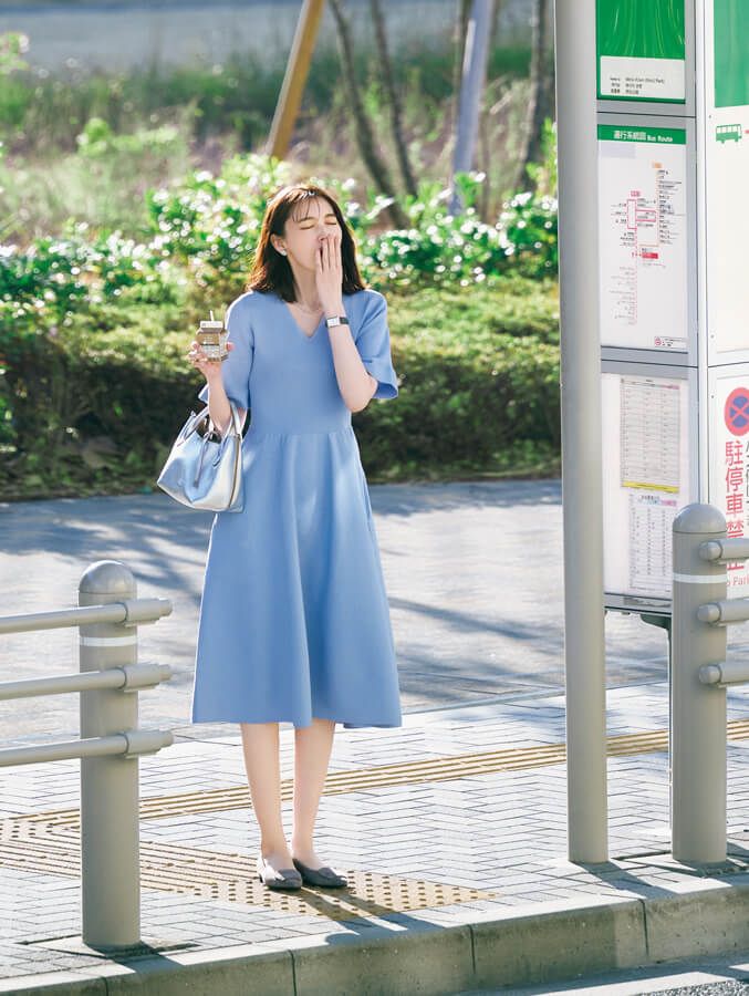 頭がスムーズに回らない朝支度もきれい色のニットワンピが頼り!