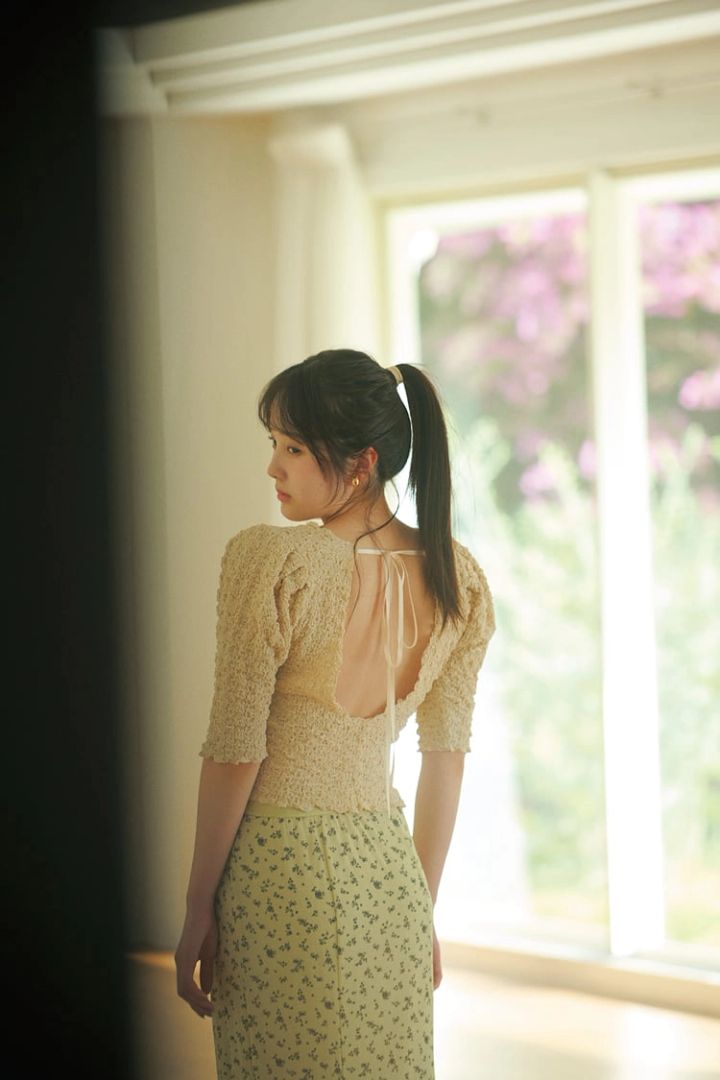 体のラインは拾いつつ、そでのパフ感でメリハリのあるデザインのトップスが上品さを演出。