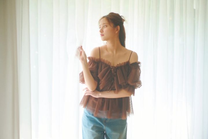 ブラウンチュールオフショルトップス 9,900円/dazzlin デニムパンツ 7,920円/Lumier