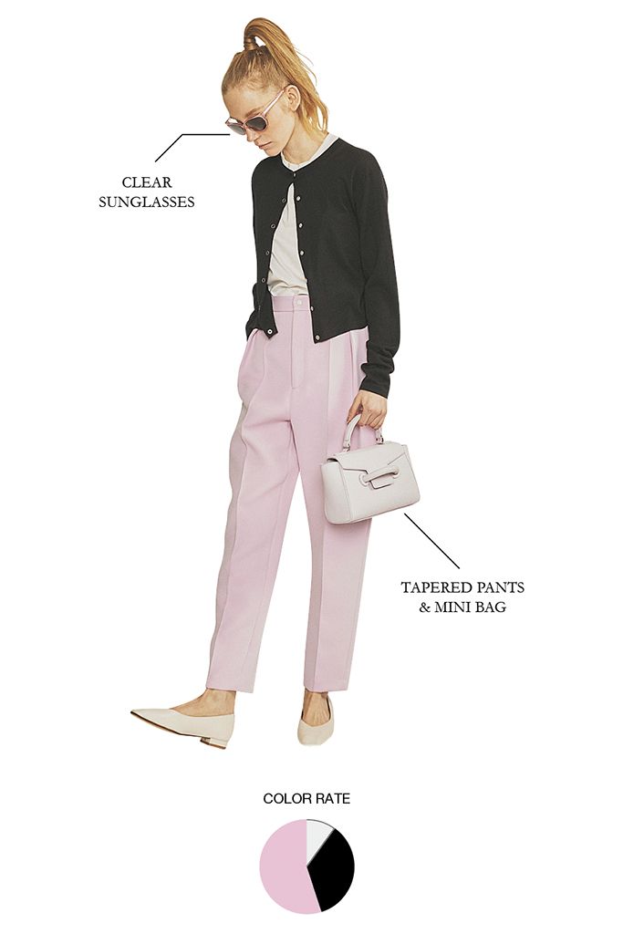 センタープレス入りのスラックスでコンサバな組み合わせを違和感なくトーンアップ。青みがかったピンクなら、クールなニュアンスが加わり大人っぽく。