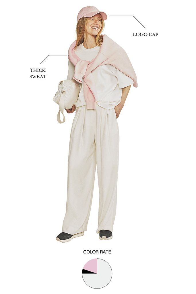 薄い色づきのピンクを大きく着ず、アクセントづかいすることで、白の延長でリズムのいいワントーンが完成。淡色かつルーズなシルエットの膨張感を、黒スニーカーで抑制。