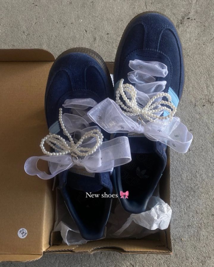 靴ひもを透け感のあるadidas柄リボンに変更し、パールビーズが連なったリボンチャームを組み合わせてアレンジした@matuko5342さん。ネイビーのadidasスニーカーの落ち着いた雰囲気を残しながら、ガーリーな要素もバッチリ!