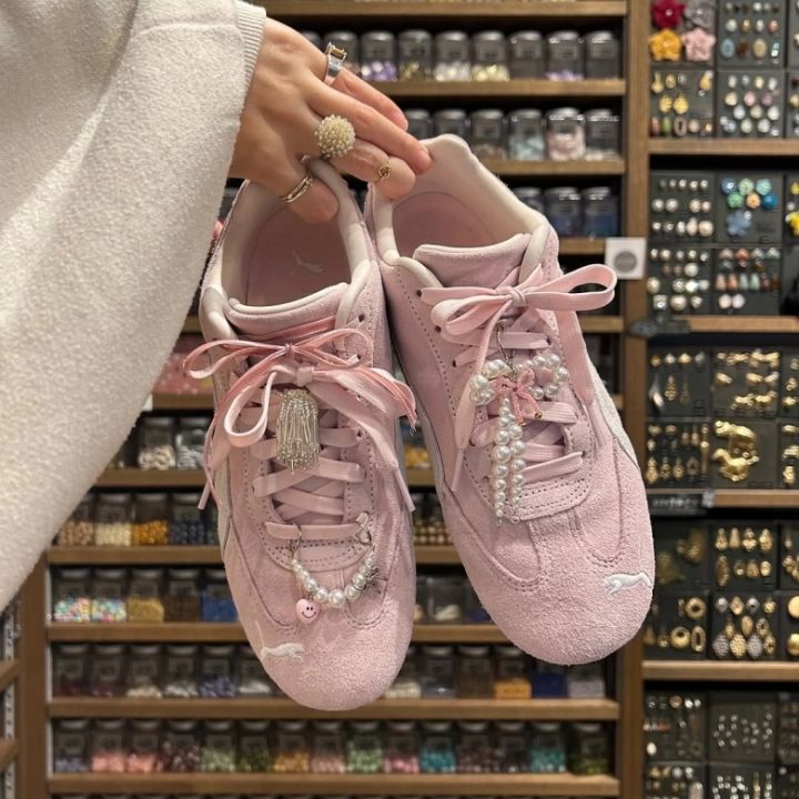 ピンク色のpumaスニーカーに、さまざまなリボンデコアイテムを組み合わせてアレンジした@dua_osakaさん。右足は、一番上にベロアリボンをつけてダブルリボンに♪他にも、キラキラのデコパーツやリボン型のパールチェーン、にこにこビーズなどをスニーカーにたっぷりつけてアレンジしています。