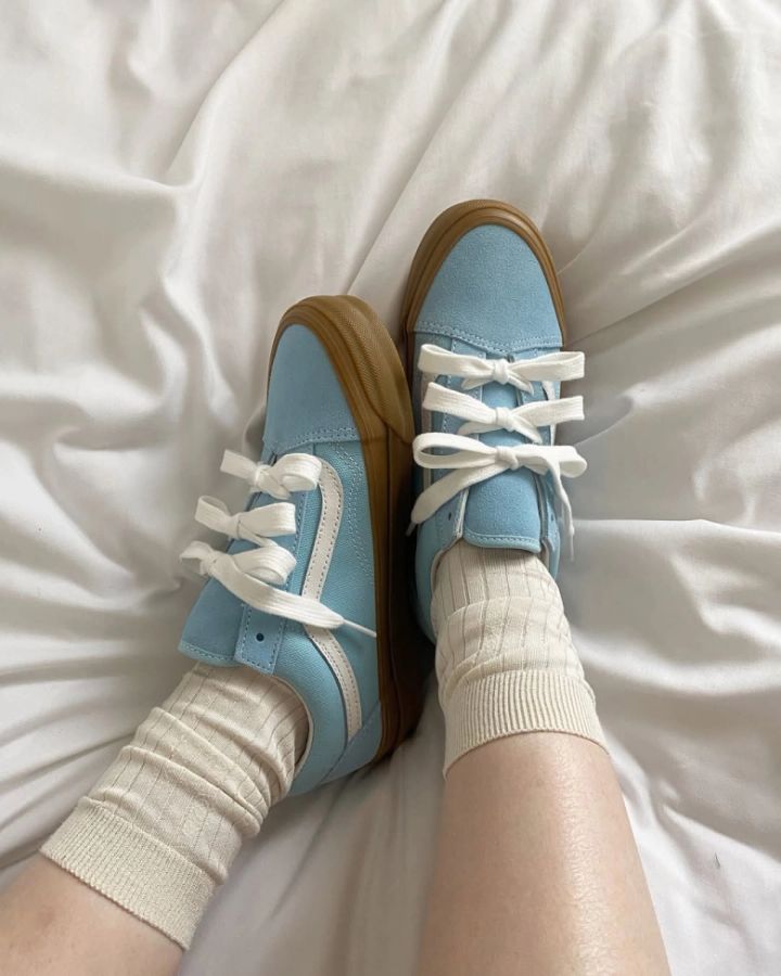 VANSスニーカーの靴ひもをリボンアレンジした@kuma___m1さん。水色のスニーカー×真っ白な三連リボンシューレースは、思わずマネしたくなる爽やかかわいい組み合わせ♡シンプルながらも目を引くアレンジです。