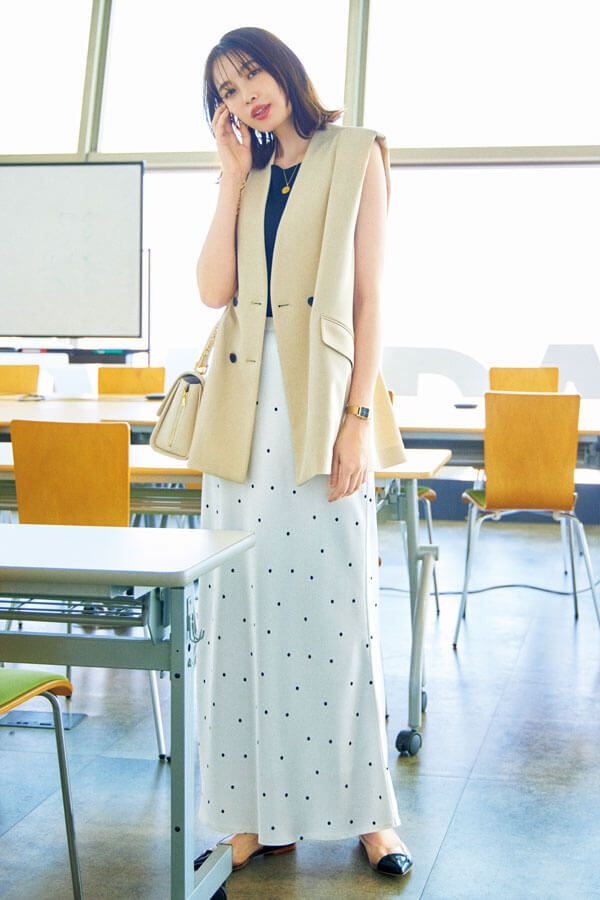 ジレ¥13,200/ココ ディール キャミソール¥5,990/アンフィーロ(オンワード樫山) スカート¥17,600/ジャスグリッティー イヤリング¥3,300/アネモネ(サンポークリエイト) ネックレス¥11,000/チビ・ジュエルズ(チビジュエルズ・ジャパン) 時計¥40,700/ココシュニック バッグ¥12,100/MERCURYDUO(MERCURYDUO ルミネエスト新宿店) パンプス¥40,700/チェンバー(クルーズ ショールーム)