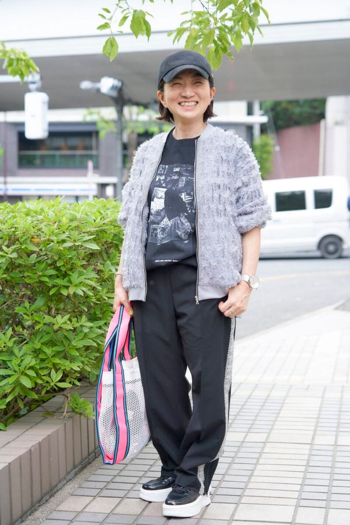 推しのライブやファンミーティングに出かけるときは、ライブのイメージに合わせてストリートミックスに。「私の推しは、BIGBANGのG-DRAGONと、BTSのVです」(金さん)。1986年HAKKAコレクションをプリントしたTシャツと、レースのラインつきのトラックパンツを合わせました。ブルゾンは、チュールフリンジにレース刺しゅうをあしらったフェミニンなデザインで、夏に着ても肌ざわりがいい軽やかなポリエステル素材。今日のようなカジュアルにも、スカートやワンピースのきれいめにも合います。