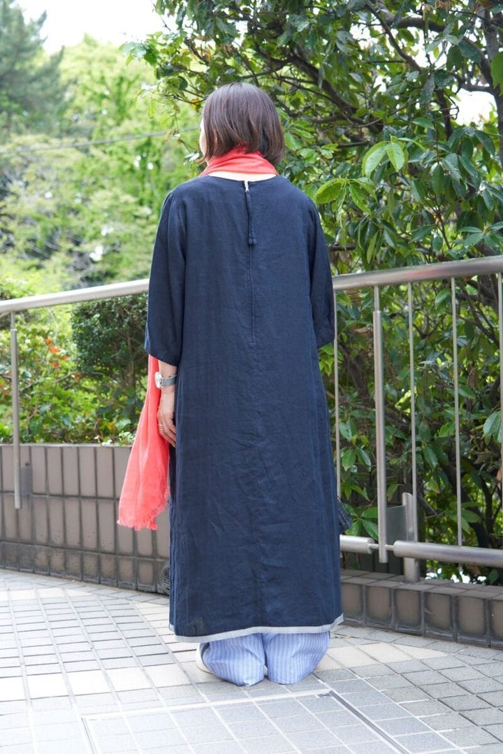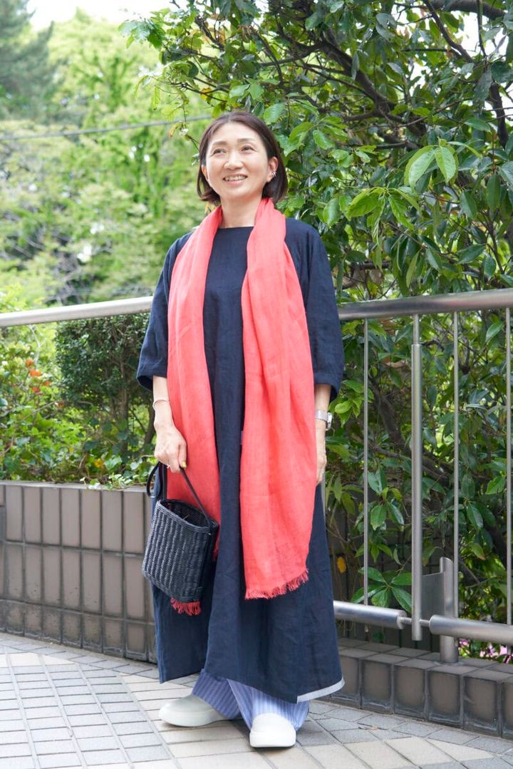 日曜日は気のおけない友だちと美味しいランチへ。「オフの日はゆるりとしたワンピーススタイルで過ごすことが多いのですが、ストライプのパンツをレイヤードしてカジュアル感を出しました」と金さん。リネンブロードのワンピースは、エアーイン加工で着心地がさらりと軽やか。パンツはゆったりシルエットとウエストゴムで、はき心地◎。きれいなコーラルレッドのストールを差し色にして、かごバッグで季節感をプラスしました。