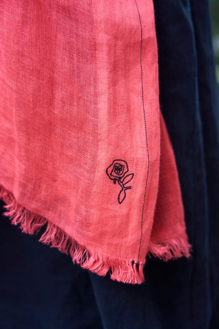 コーラルレッドが鮮やかなリネンストールは、落ちついたトーンのコーデを華やかに演出します。冷房が強い室内や気温が下がった夜には、無造作に巻いてもサマになるアイテム。黒の花刺しゅうが大人っぽくてエキゾチックです。