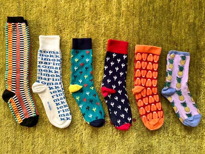 写真の靴下は上からミナ ペルホネン、マリメッコ、イデー×柚木沙弥郎のもので、私の一軍靴下たちです。