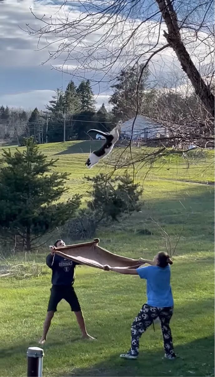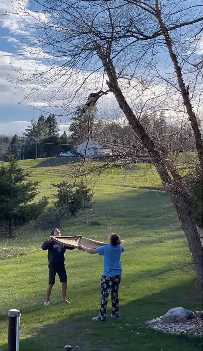 木の下で毛布を広げて構えていた男女。 この2人の視線の先には、ピンチに陥っているネコの姿がありました!