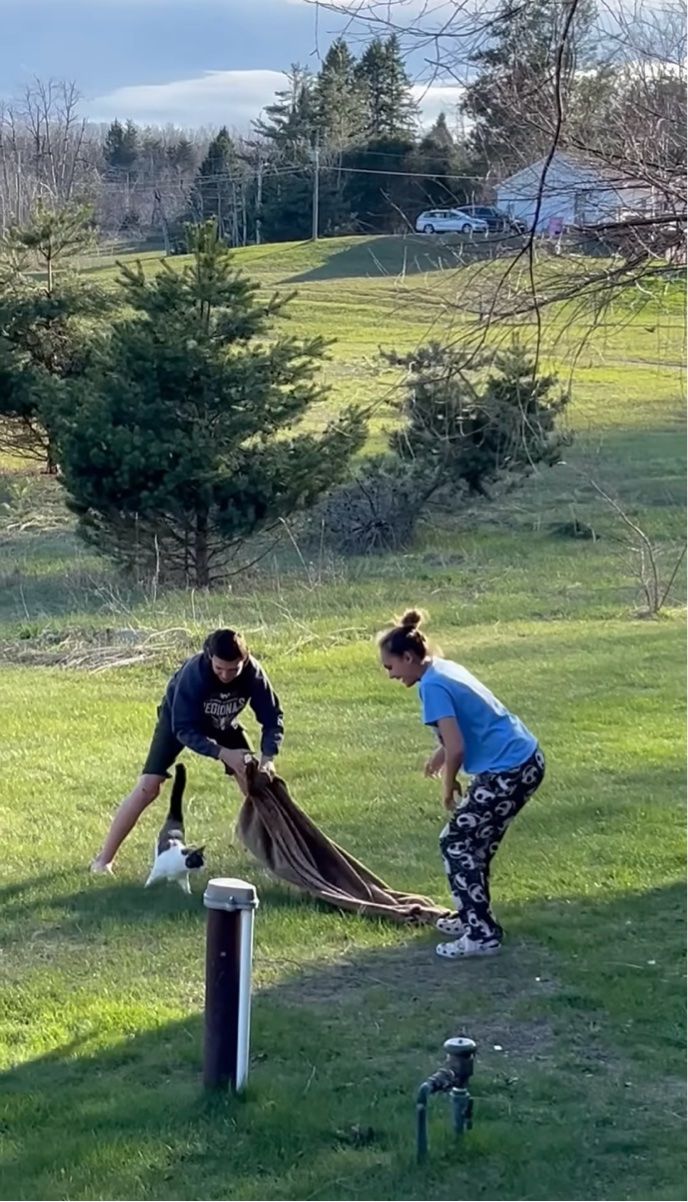 この瞬間を待っていた2人は、「今だ!!」とばかりに息を合わせてネコを毛布でキャッチ。