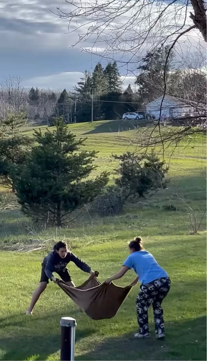 3. 木の下で毛布を広げる人たち。2人の視線の先には・・木から降りられなくなったネコが!【アメリカ・】