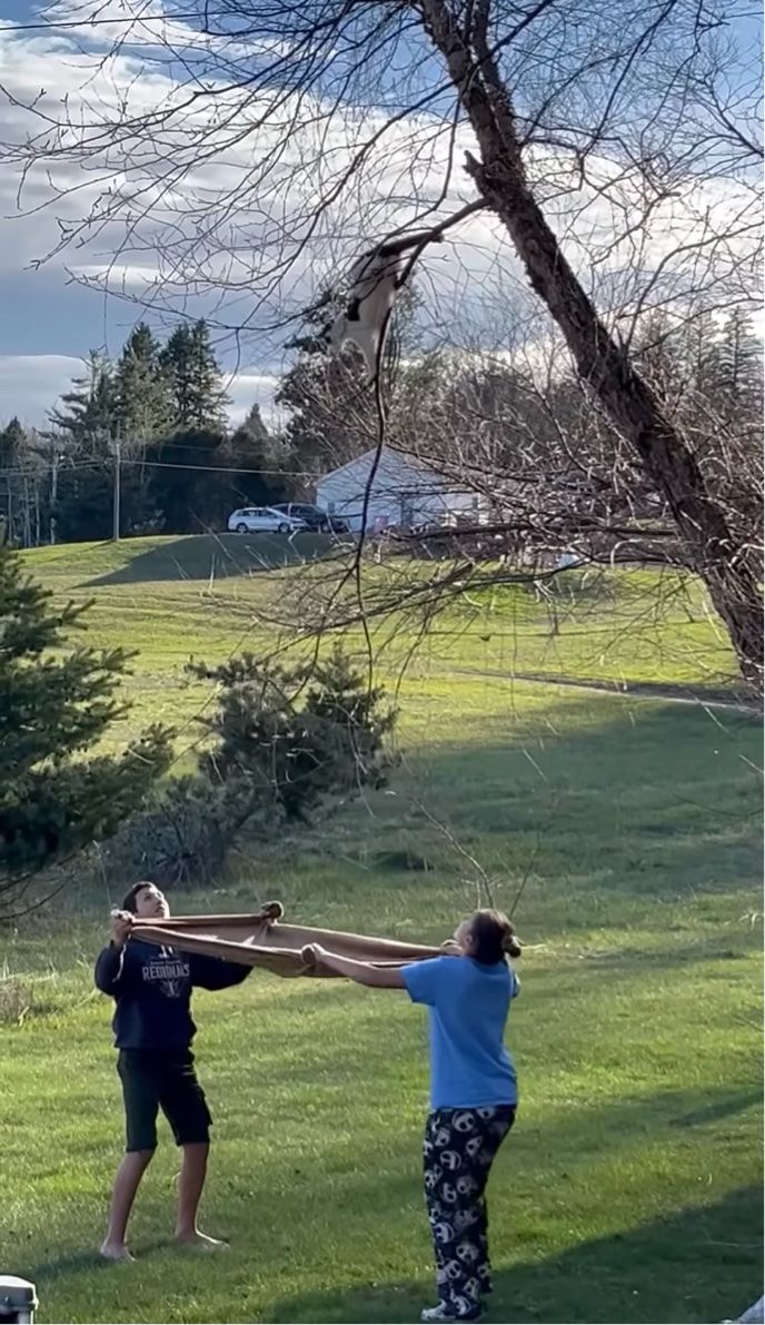 木の下で毛布を広げる人たち。2人の視線の先には・・木から降りられなくなったネコが!【アメリカ・】